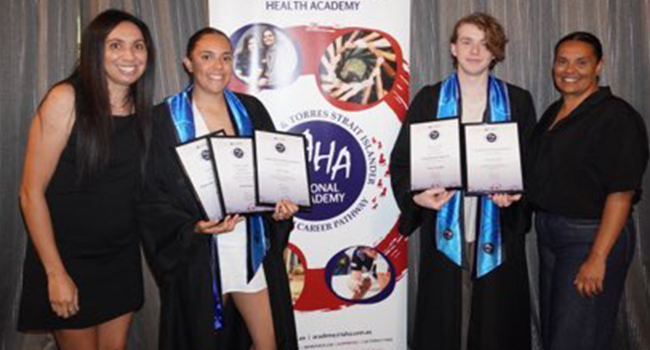 Bottom: Sasha Harrington, Manager Aboriginal Workforce, Amarli King and Tayis Cavanagh, IAHA graduates, and Barrie Jenkins Aboriginal Workforce Coordinator at the IAHA graduation ceremony.